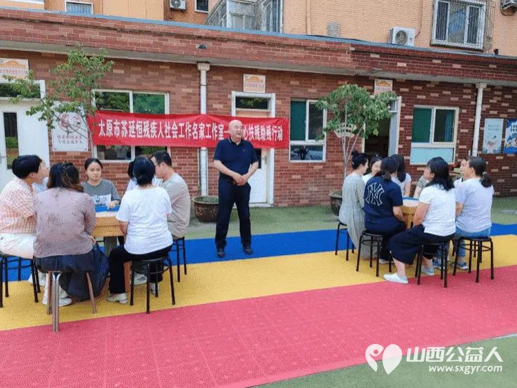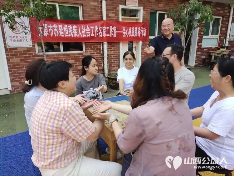 太原市苏延恒残疾人社会工作名家工作室的苏老师在太原市迎泽区特殊教育中心学校为全体一线教师进行了一次沙盘减压活动