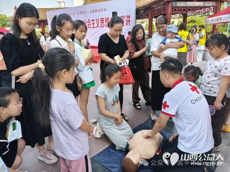 6月27日上午,高平市红十字会以“文明实践我行动·文明集市”志愿服务活动为契机,组织工作人员及志愿者走进新北小区为社区群众开展应急救护知识宣传志愿服务。