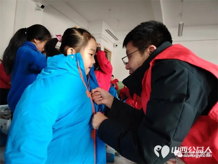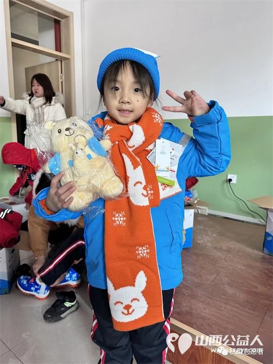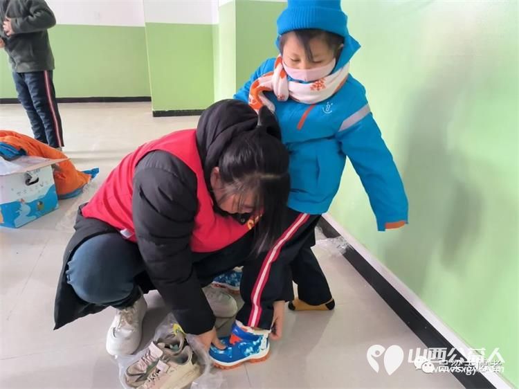 看,志愿者们为孩子们领取温暖包,分发温暖包,并现场为孩子们穿戴整齐,看着孩子们脸上洋溢着幸福的笑容,志愿者的心里也暖暖的。
