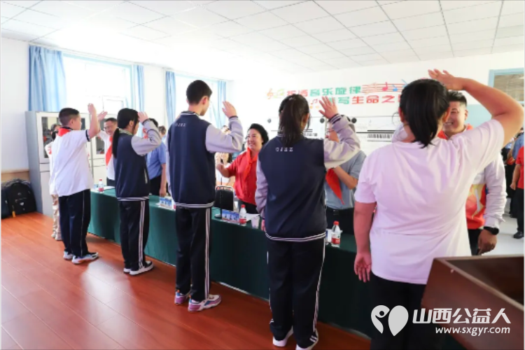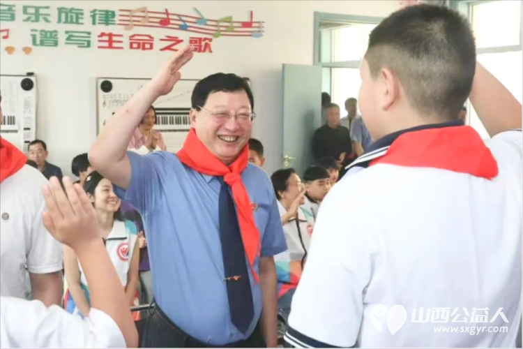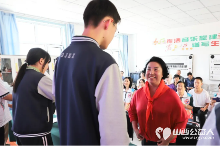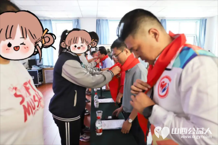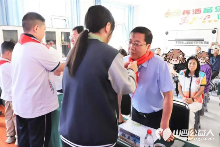 学生代表为出席活动的王素娟会长,古交市市委常委、副市长郝平贵,古交市人民检察院党组书记、检察长马晖,古交市教育体育局局长刘晓东,共青团古交市委书记王宏山,太原市盛世开元比亚迪总经理刘世宏佩戴了红领巾。