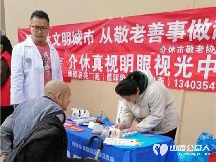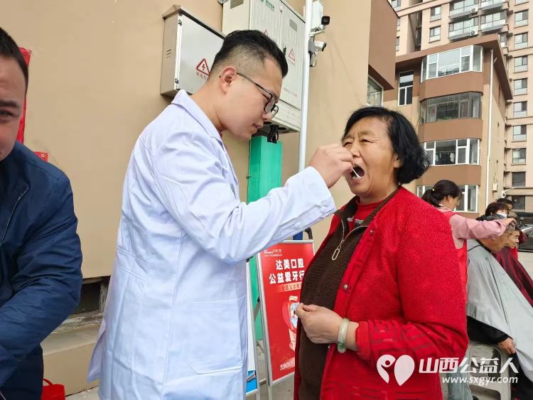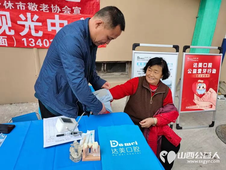 真视明医护人员为老人测视力、贴眼贴;达美口腔为老人量血压、检查口腔;安康医疗器械为老人测听力。