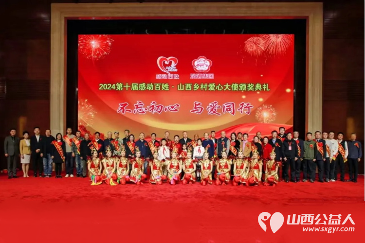 第十届感动百姓·山西乡村爱心大使合影 2024第十届感动百姓山西乡村爱心大使名单: 1、葛才贵 灵丘县平型关义工联合会; 2、郭双勇 平顺县青羊镇中五井村;3、李艳珍 吕梁市规划和自然资源局; 4、吴志花 怀仁市云东街道同仁家园社区;5、邬 娜 厚德礼蜂业有限公司; 6、杨喜风 太原市比家美养老院;7、姚何林 陵川县西河底镇西河村 ;8、张德顺 霍州市白龙镇后湾村;9、张小义 山西阳光益佳爱心总队 ;10、张子薇 岚县上明乡寨子村。