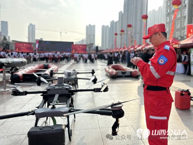 无人机中队的精彩展示则为活动注入了科技力量。于江、田波、李存宇展出15余架功能强大的无人机,这些无人机在应急救援中发挥着关键作用,可执行快速侦察、搜索救援、通信中继临时通信网络搭建等多项任务。2025年,救援队重点打造“低空技术+公益救援”工作,借助无人机搭载热成像仪、喊话器、灭火弹等设备,提升城市寻人、水域救援、森林防火、防疫消杀等任务的搜救效率。同时,致力于创建“智慧应急”协同平台,联合机场、数据运营公司等构建低空救援指挥系统,实现无人机实时调度与灾情动态监测,为吕梁市应急救援工作插上科技的翅膀,让雷锋精神在科技创新中焕发出新的活力。