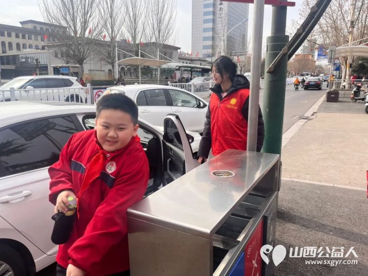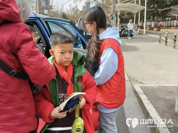 2025年2月阳泉市义工联合会组织大学生志愿者在北大街小学的校门外的“护学岗”服务