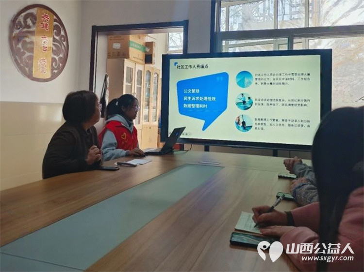 3月19日,中心成员团体太原理工大学人工智能学院旭日志愿服务队的志愿者,走进尧晨社区,为社区工作人员和居民代表开展了一场以 “AI赋能社区工作实践指南” 为主题的志愿服务活动。
