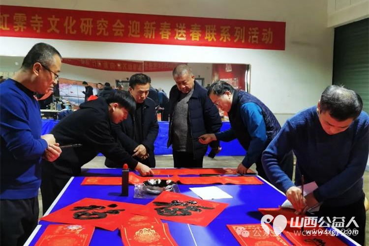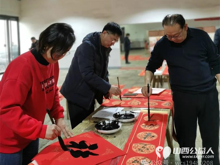 活动现场热闹非凡,嗳意融融,来自书法家协会,虹霁虹文化研究会,民进介休支部共计五支团体的书法大家挥毫泼墨、红纸翻飞,一副副散发着清新墨香、字体俊逸的春联一气呵成,字里行间透露着美好祝福和浓浓年味。