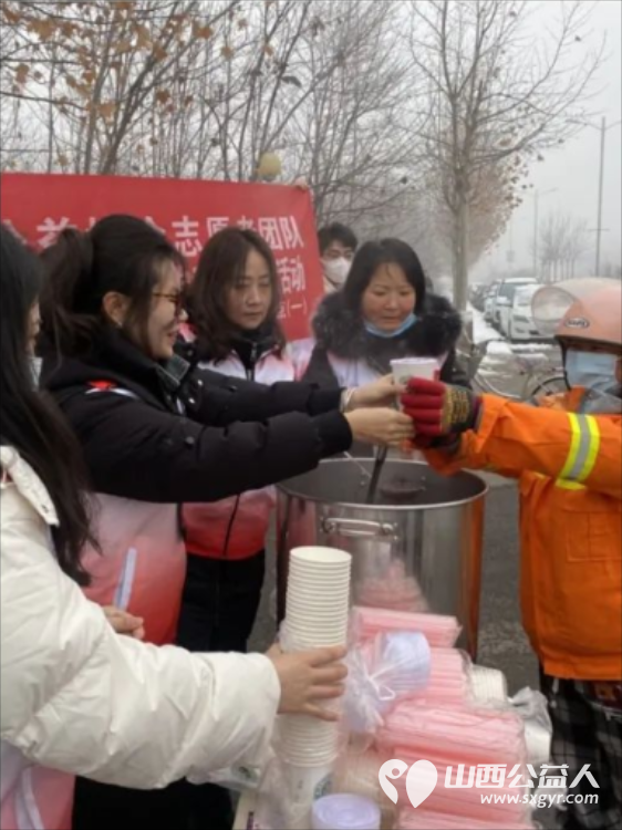 长治正能量公益协会志愿服务团队一队、筑梦志愿服务队在腊八节熬腊八粥为我们的环卫工人送上我们的微不足道的问候