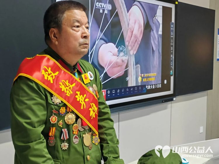 2025年4月28日,山西工商学院道德讲堂,第三届全国道德模范提名奖、太原市小店区新时代文明志愿服务队雷锋团长赵海生,一身戎装、胸挂各种奖牌奖章,身披致敬英雄老兵授带,端立舞台、铿锵有力讲述学雷锋的动人足迹。台下学子凝声静气,聆听一桩桩、一件件学雷锋志愿服务先进事迹。