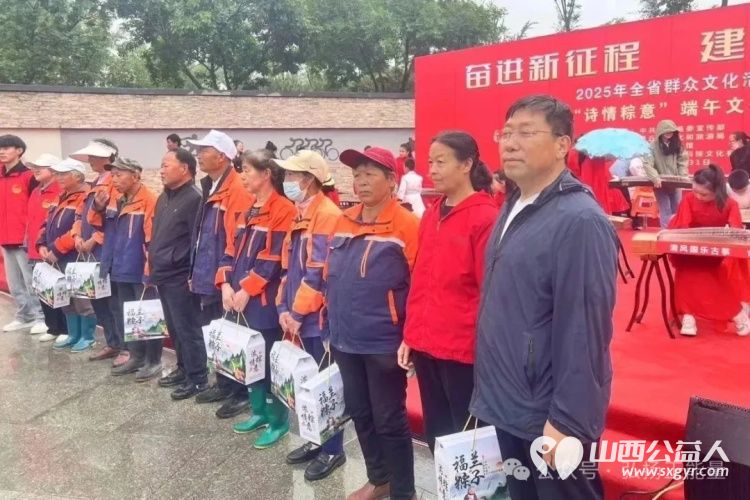 发放仪式现场,特别聚焦城市中最辛勤的身影。在县民政局李栓明局长宣布“灵丘县第八届“浓情端午·公益放粽”活动,现在正式启动”之后,与会领导首先向环卫工人与岗勤民警代表赠送饱含敬意的端午粽礼,并叮嘱他们在做好工作的同时,保重身体。主持人深情致敬这些“城市美容师”和“平安守护者”:“城市的整洁有序、社会的平安稳定,离不开你们日复一日的默默坚守与付出!现场掌声献给这些平凡而伟大的劳动者,祝福他们端午安康。”