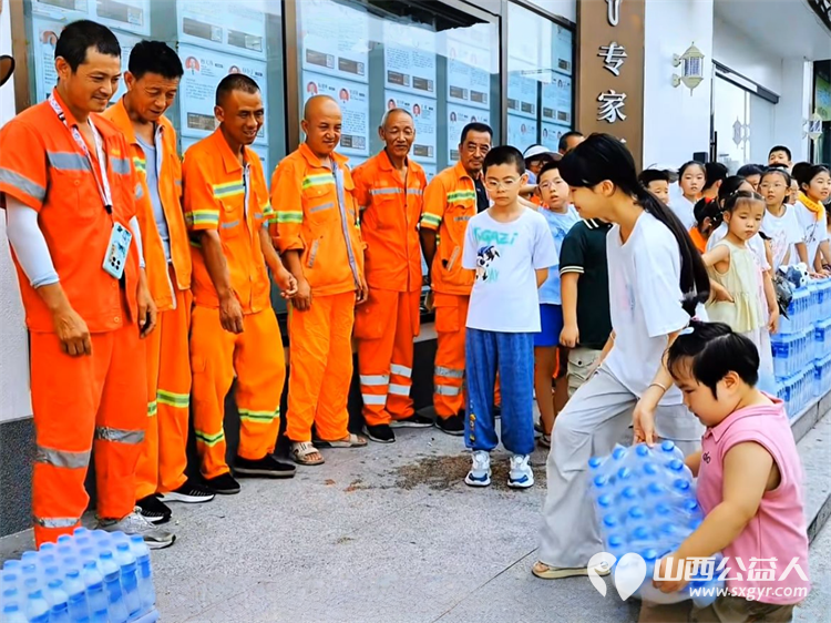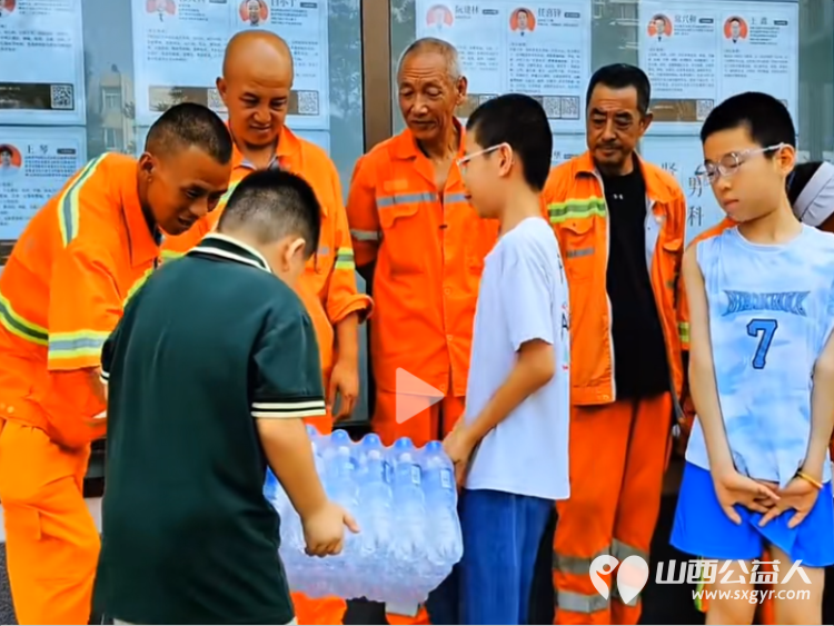 省一天零用钱送环卫工人一份清凉----太原市营盘街道南内环街二社区“营在未来”未成年人公益捐赠活动为烈日下的环卫工人送去矿泉水