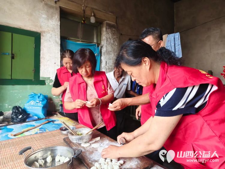 介休市敬老协会志愿者在义安镇礼世村入户特困老人80岁张连胜家中为老人擦玻璃套被罩缝被子包饺子
