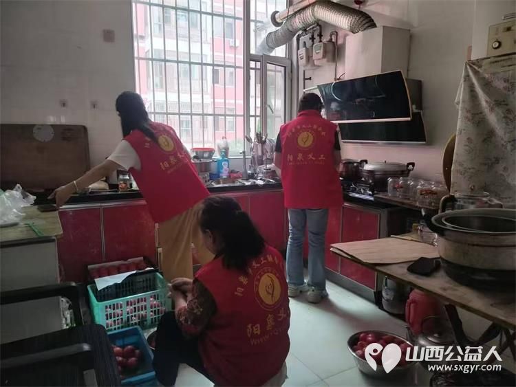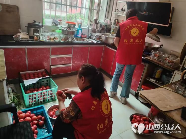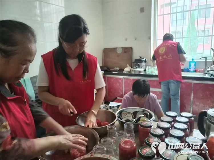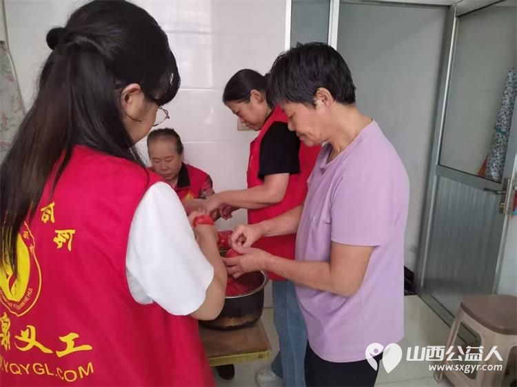 2025年8月18日,阳泉市义工联合会组织志愿者到平定水磨湾服务亲情陪护对象张翠兰帮助做西红柿酱。