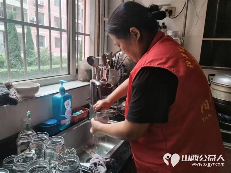 阳泉市义工联合会组织志愿者到平定水磨湾服务亲情陪护对象张翠兰帮助做西红柿酱