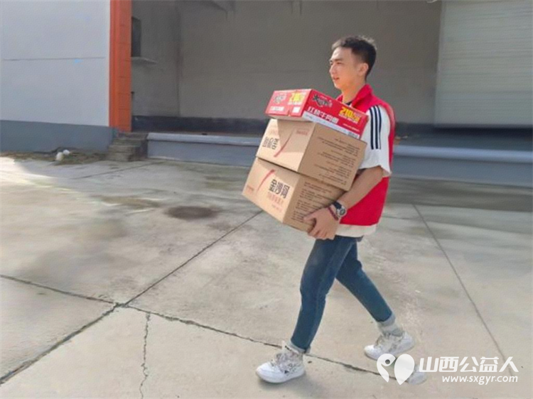 志愿者在户外搬运整理物资