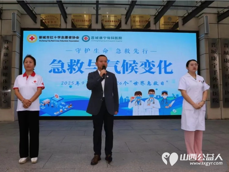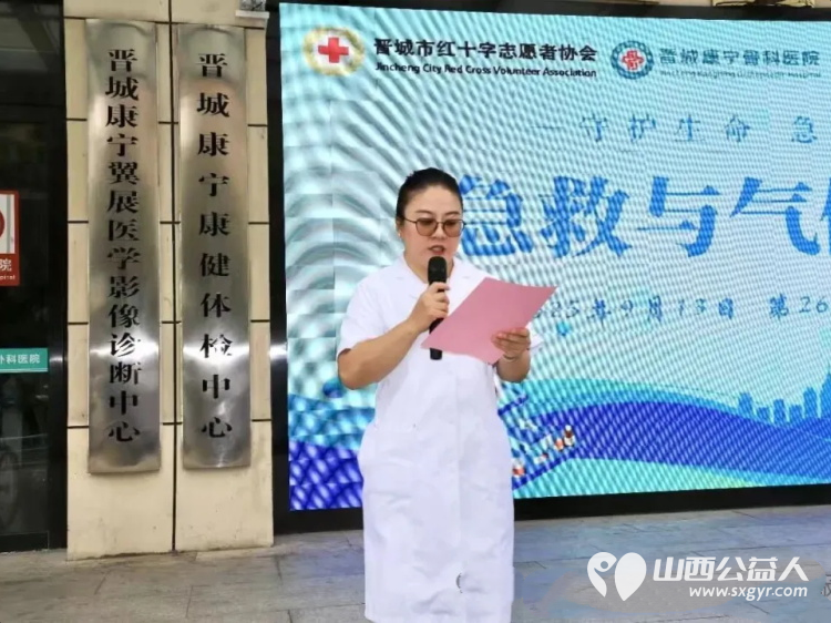 活动由晋城市红十字志愿者协会副会长兼秘书长于斌主持。9点整,活动正式开始。主持人于斌首先介绍了“世界急救日”的由来以及本次活动的意义,强调在气候变化背景下“人人学急救,人人懂急救”的重要意义。