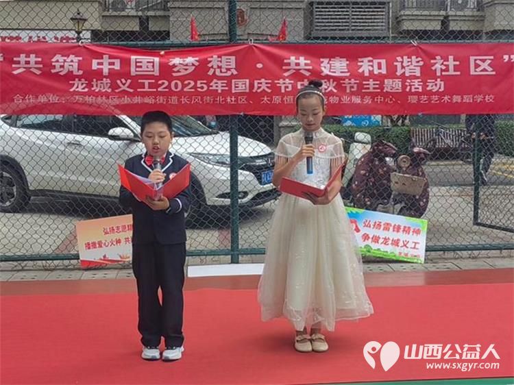 为弘扬爱国主义精神,传承红色基因,增强社区居民的凝聚力和向心力,2025年9月27日,龙城义工联合万柏林区小井峪街道长风街北社区居委会、太原恒大雅苑物业服务中心、璎艺艺术舞蹈学校及爱心单位特策划国庆节社区系列活动。