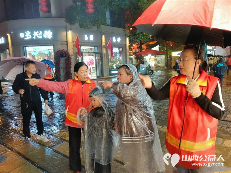 志愿服务----忻州市忻府志愿者风雨中一样有彩虹他们淋着雨撑着伞坚守在雨中随时准备为游客服务从未却步坚守如一