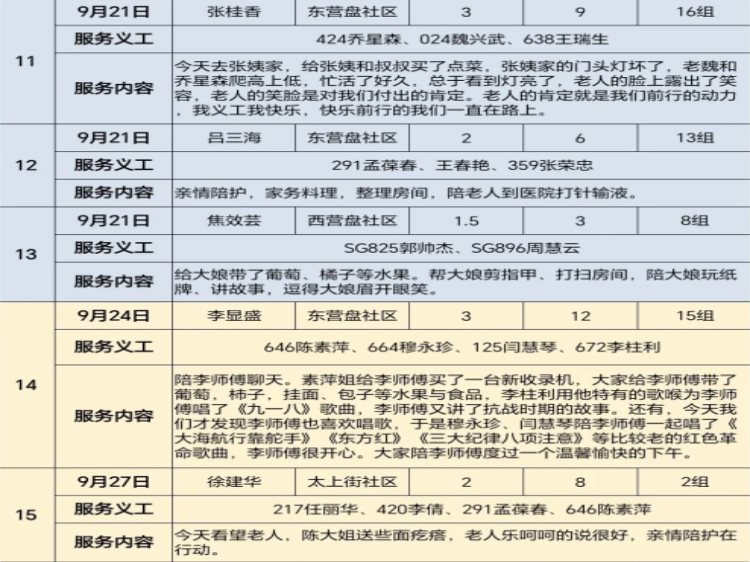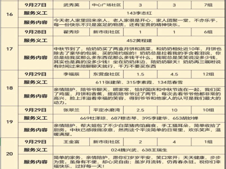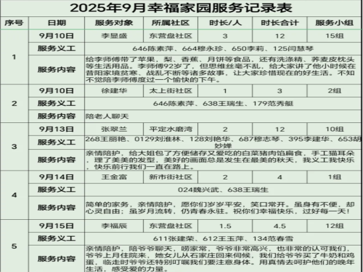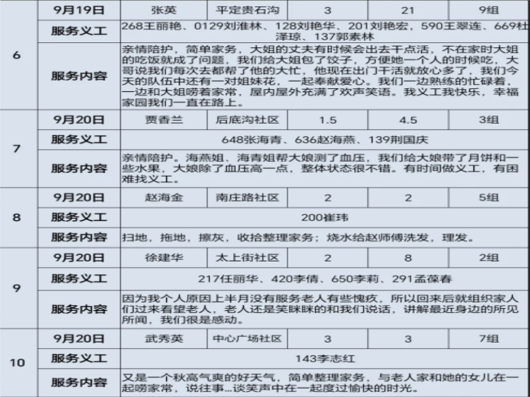 2025年9月,阳泉市义工联一如既往的开展幸福家园敬老服务。本月共有36名义工服务了20次。36名义工对新市街社区、东营盘社区、西营盘社区、太上街社区、后底沟社区、南庄路社区、中心广场社区、平定水磨湾和平定贵石沟村的13位服务对象提供了志愿服务。服务总时长达8070分钟(134.5小时)。