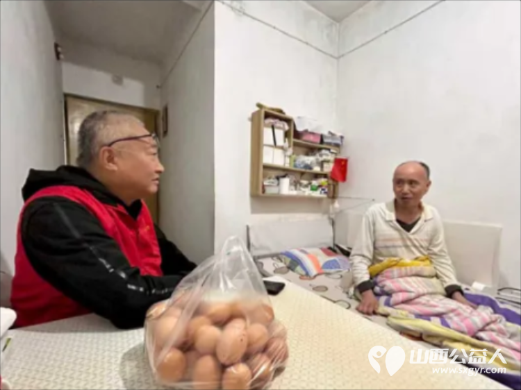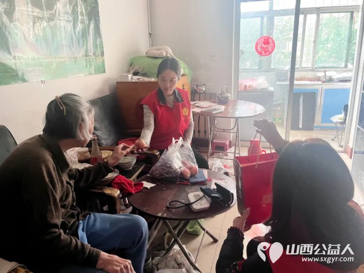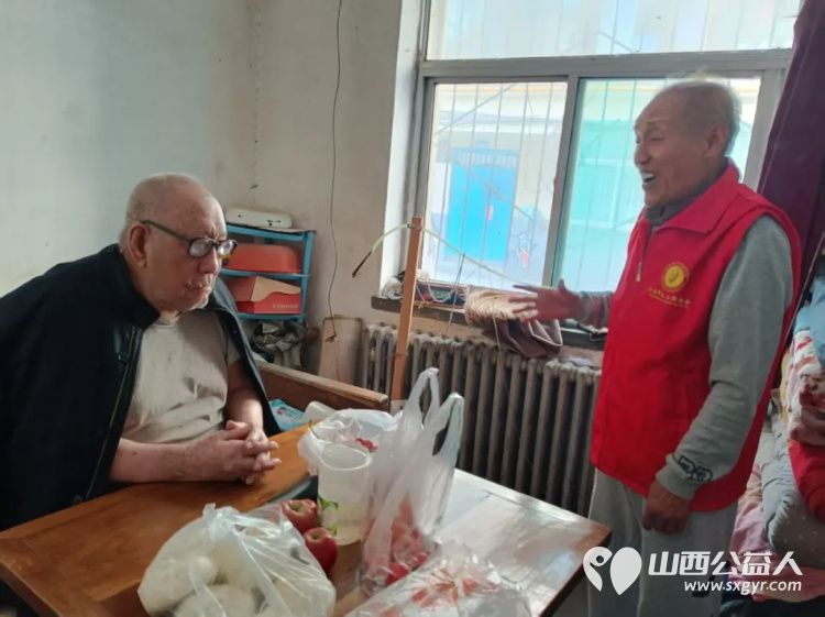 给李师傅带了苹果,梨、香蕉、月饼等食品,还有洗涤精、荞麦皮枕头等生活用品,李师傅92岁了,但思维丝毫不乱,给大家讲了他小时候在昔阳家境贫寒、战乱不断等诸多故事