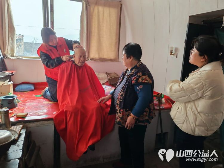 介休市敬老协会志愿者来到连福镇刘家山村入户97岁陆来广老人家中为老人上门理发