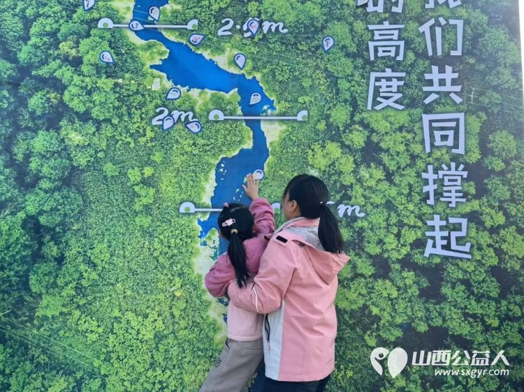 点位二“跟河流比身高” 背景画面是河流的造型。在贴纸上签名,并贴到“河边”,看看谁更高。在可触摸的最高点,贴下对河流的祝福