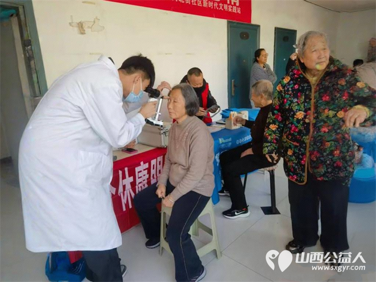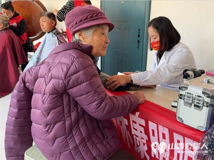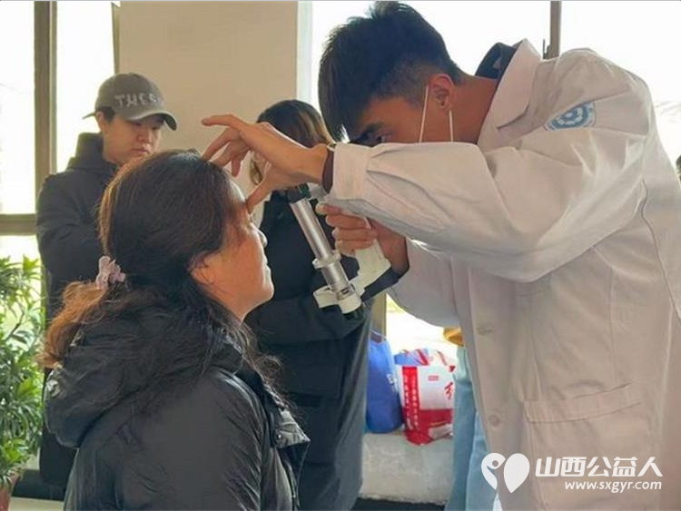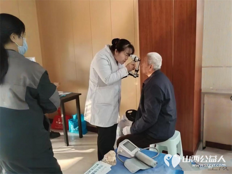 康明眼科和绵山眼科的医护人员为老人测试力、白内障检查。