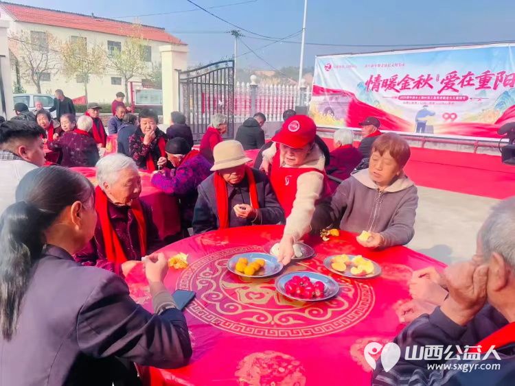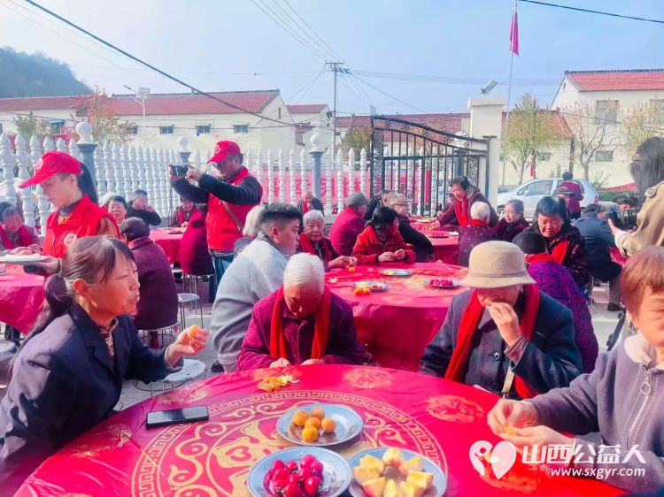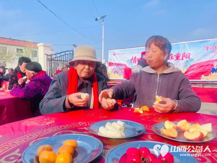 共享时光。活动最后,大家围坐在一起,分享准备好的美食,老人们脸上洋溢着幸福的笑容。乡村的小院里充满了温情,志愿者与老人们度过了一个难忘的重阳佳节。