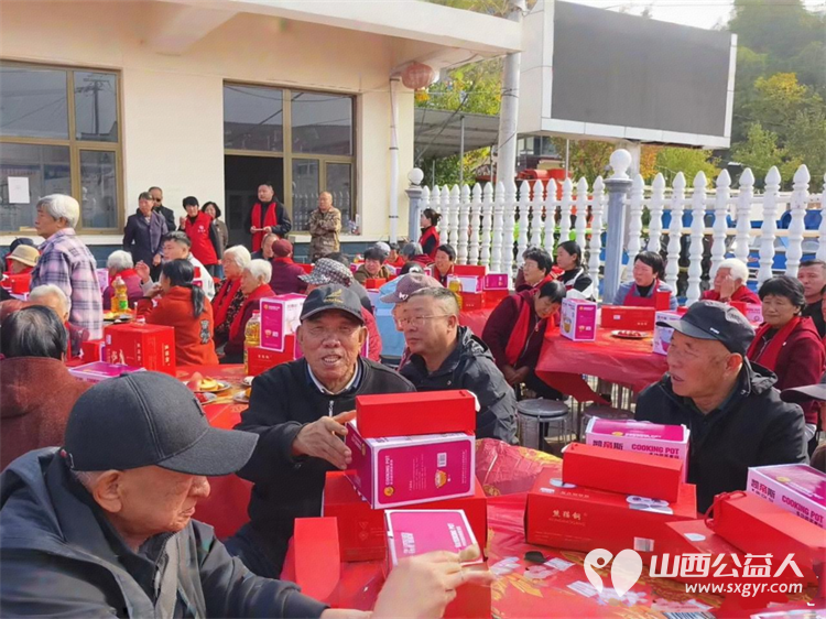 包村单位(区行政审批局),为老人们准备了靠背椅。土脚村委为每位老人发放了慰问金。区正能量公益协会、万农信合作社、璐鑫建筑有限公司、鸣宇畜牧养殖有限公司分别为活动赞助了锅、杯、面、油等实用物品,传递着青春一代的敬意。