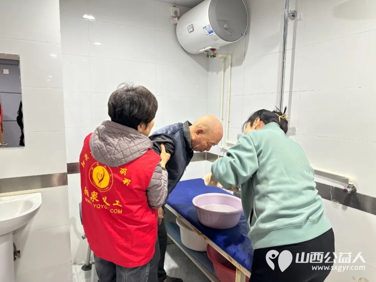 协助养老院的工作人员,帮老人清洗头发