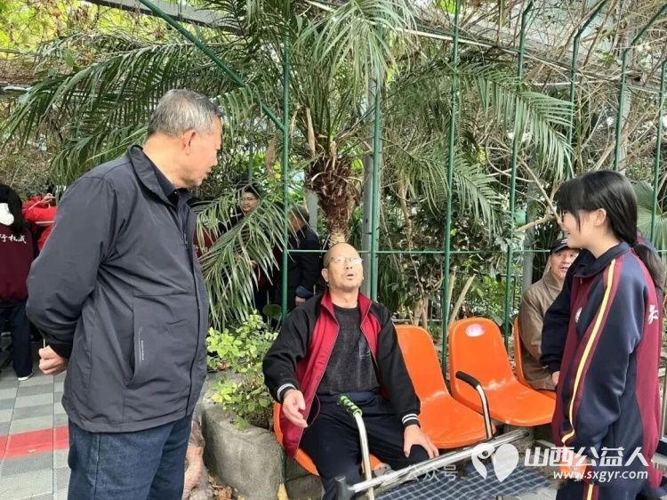 天伦松鹤养老院敬老活动。忻一职副校长张国柱听老人讲过往的经历。