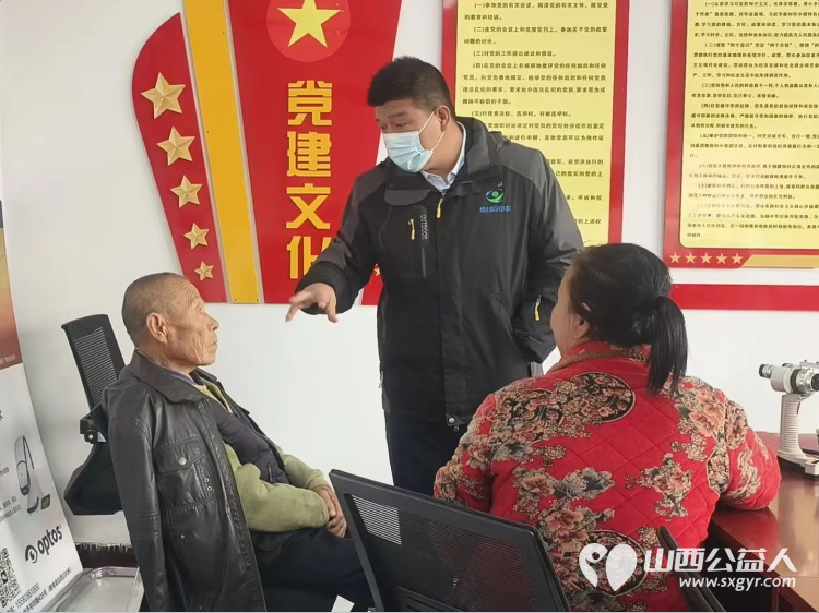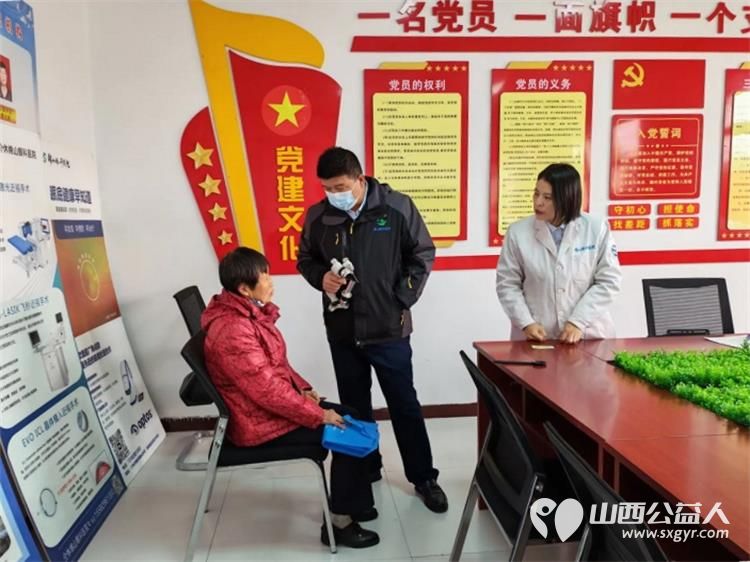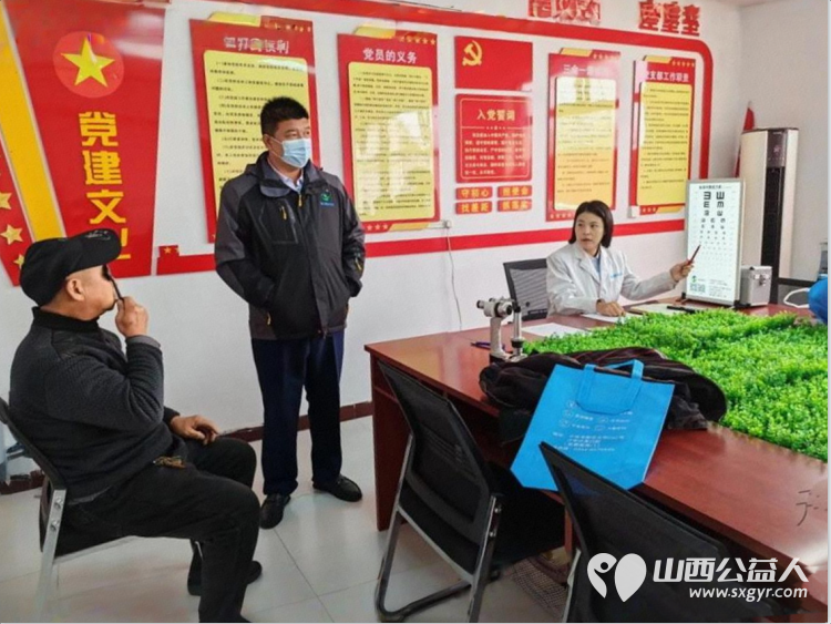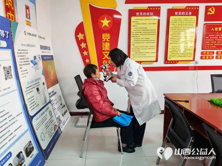 绵山眼科的医护人员为老人测视力、 白内障检查