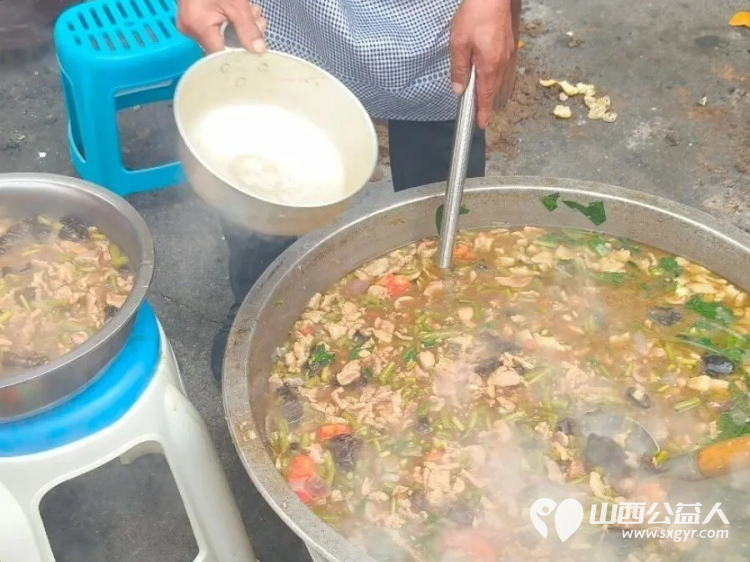 正午时分,村委会大院里香气四溢。村两委牵头组织志愿者,现场烹制过油肉等地方特色美食。热气腾腾的饭菜和枣糕被一一端上桌,村民们围坐在一起,一边品尝美味,一边拉着家常,一顿午餐吃出了邻里间的温暖情谊。
