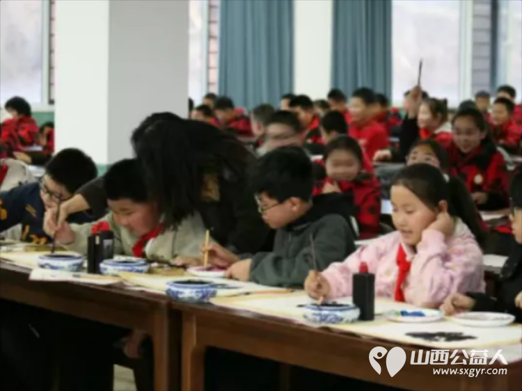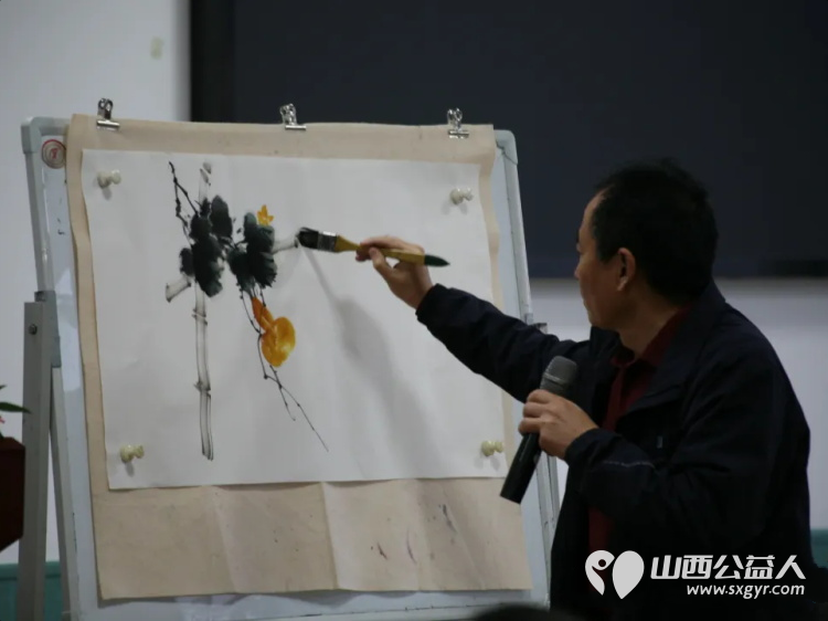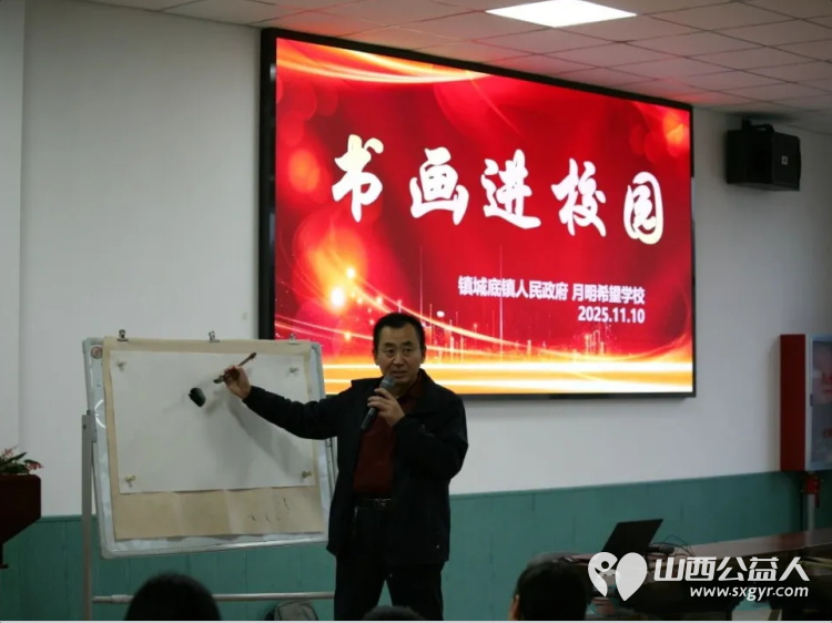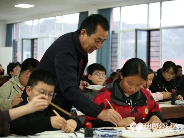 书画进校园翰墨润桃李----太原书画家阎政维走进古交市月明希望学校为师生讲解了书画的实践场景让传统文化在校园生根发芽