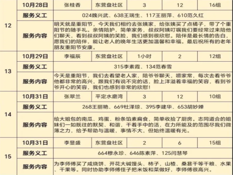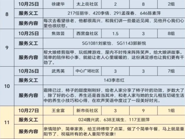 有这样一群人,用他们的双手无私奉献;有这样一群人,用他们的热情温暖着你我;有这样一群人,用他们的行动让社会充满爱。他们有一个共同的名字-----阳泉义工。2025年10月,阳泉市义工联一如既往的开展幸福家园敬老服务。本月共有25名义工服务了15次。25名义工对新市街社区、东营盘社区、西营盘社区、太上街社区、南庄路社区、中心广场社区、平定水磨湾和平定贵石沟村的11位服务对象提供了志愿服务。服务总时长达5640分钟(94小时)。