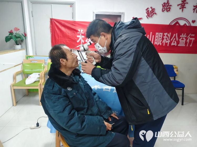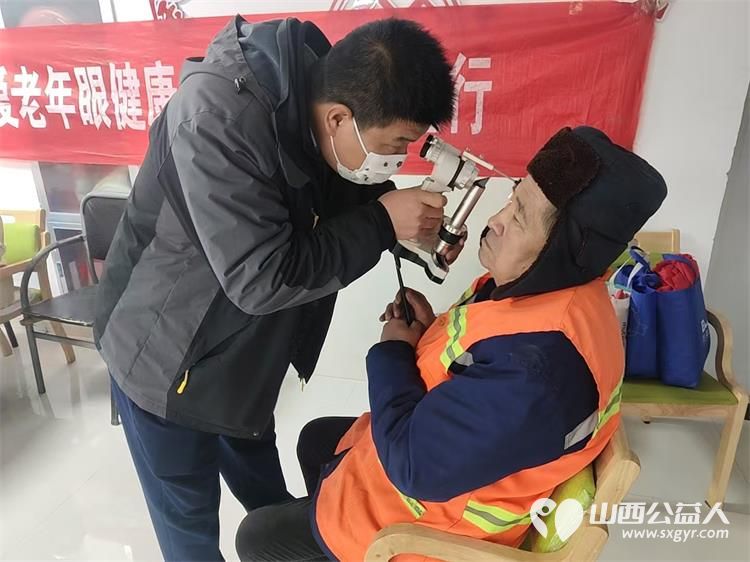 绵山眼科的医护人员为老人测试力,白内障检查,爱眼护眼不是梦,眼科义诊让光明更进一步。