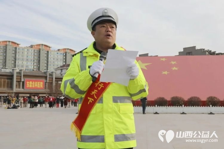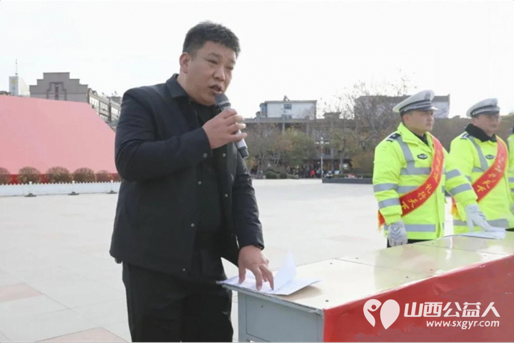 临汾市文明交通志愿者协会会长讲话,并号召警民携手、全民参与共创文明交通。