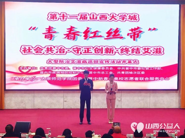 在世界艾滋病日”来临之际,由主办单位:共青团晋中市委、晋中市卫健委、中共晋中市委社会工作部、晋中市总工会、晋中市疾控中心以及在驻晋中各高校团委,承办单位:太原师范学院团委、晋中新青年高校志愿者联合服务中心,联合举办的以“社会共治.守正创新.终结艾滋”为主题的“第十一届山西大学城青春红丝带”防艾巡回宣传活动,在太原师范学院正式开幕。