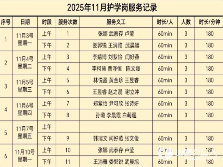 2025年11月,护学岗服务共39次,116人次参加服务,服务时长共计6960分钟。
