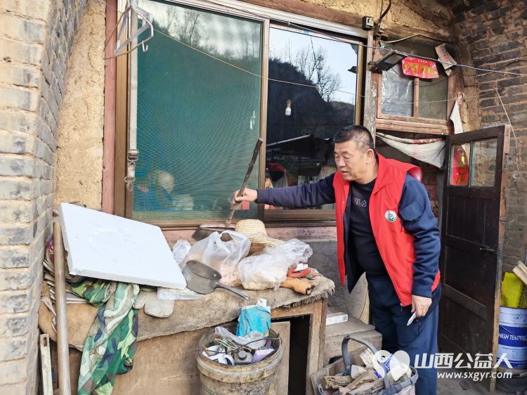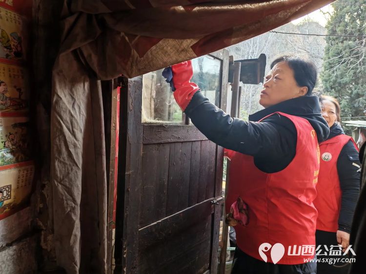 介休市敬老协会志愿者活动在绵山镇董家庄村入户90岁特困乔玉琪老人家中为老人打扫室内外卫生做饭包饺子