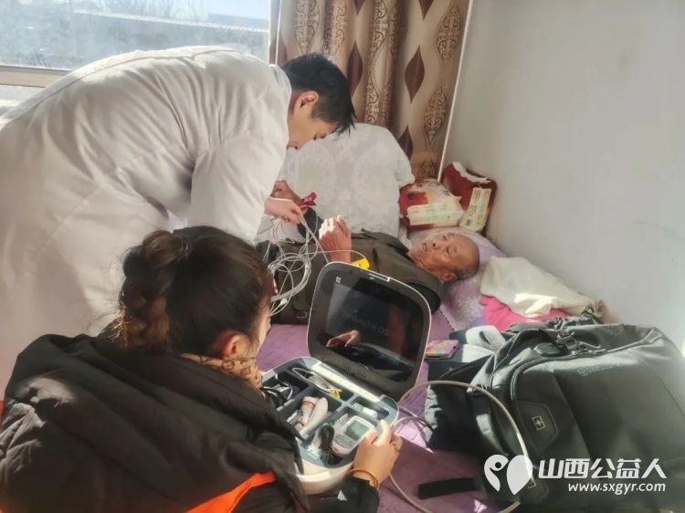 来自大同市方舟社会工作服务中心的专业医疗志愿服务小组现场展开义诊,为老人测量血压、血糖、心率等关键指标,并将检测结果与科学建议清晰告知家属,同时赠送了内含常用物资的爱心应急包。