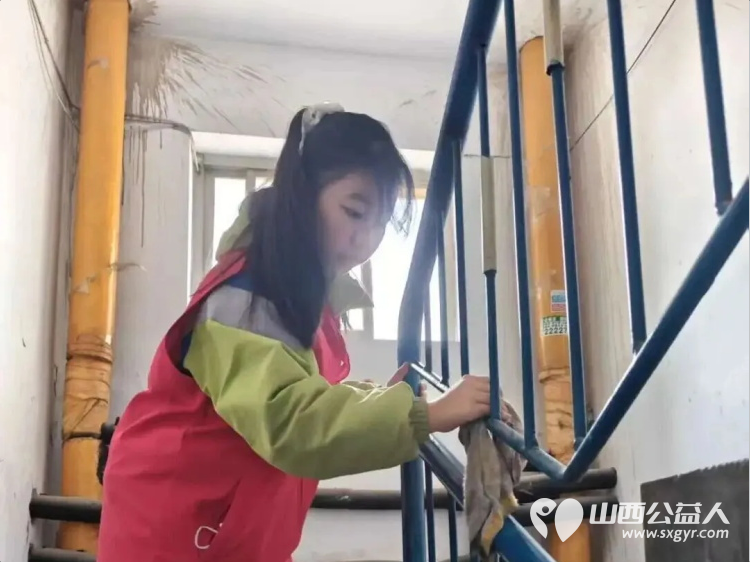 楼道清洁组手持抹布,对楼梯台阶、扶手进行彻底擦拭,连缝隙墙角等卫生死角也一一清理到位。小小志愿者们干劲十足,认真打扫墙边堆放的杂物、擦拭楼道扶手,用稚嫩的双手传递温暖,成为冬日里一道灵动鲜活的“红色风景线”。