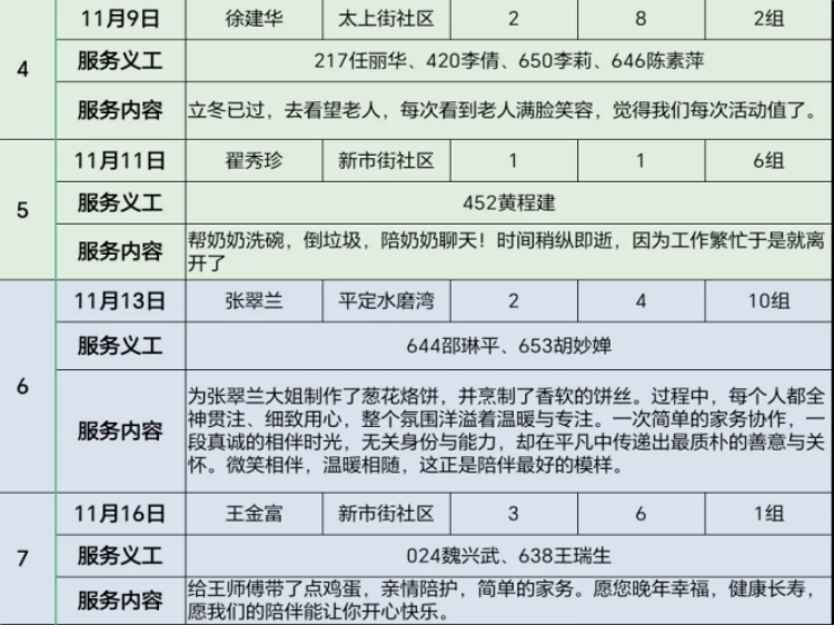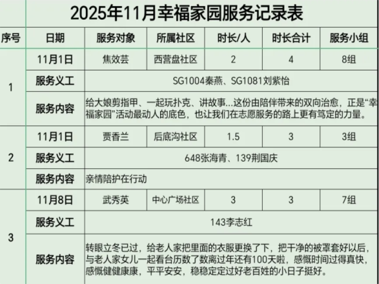 2025年11月幸福家园项目服务记录 2025年11月幸福家园项目义工服务人员记录:张海青、荆国庆、李志红、任丽华、李倩、李莉、陈素萍、邵琳平、胡妙婵、魏兴武、王瑞生、黄程建、郭素林、翟琴琴、李艳萍、穆永珍、王丽萍、范久红、郭新悦、秦燕、刘紫怡。