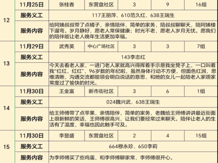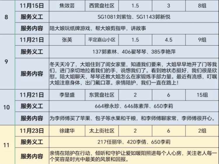 2025年11月,阳泉市义工联一如既往的开展幸福家园敬老服务。本月共有21名义工服务了15次。21名义工对新市街社区、东营盘社区、西营盘社区、后底沟社区、太上街社区、中心广场社区、平定水磨湾和平定西城南关社区的10位服务对象提供了志愿服务。服务总时长达4230分钟(70.5小时)。
