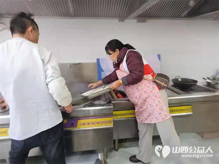 志愿者们在厨房分工协作,有的专注处理食材,有的熟练擀皮包饺子,每个人都投入了十足的热情。