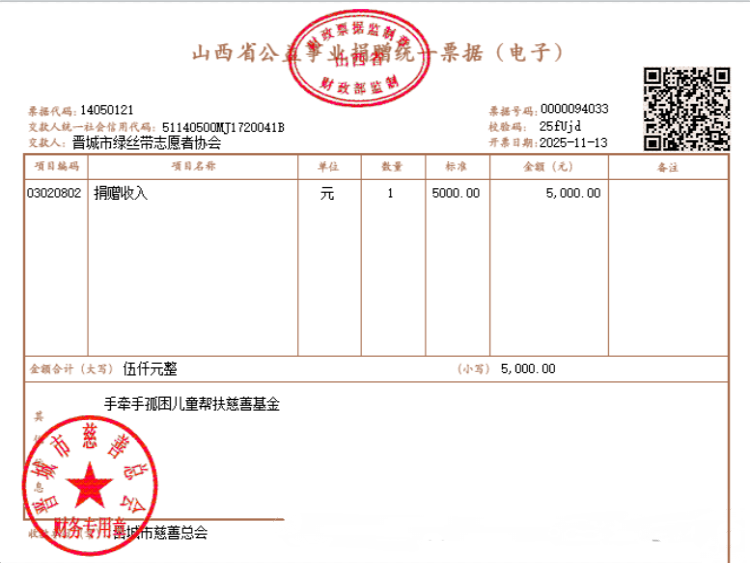 晋城市手牵手孤困儿童帮扶中心对绿丝带协会的慷慨捐赠与深度信任致以诚挚感谢。中心负责人表示:这份支持不仅是对帮扶工作的认可,更是对公益联合力量的鼓舞。中心将秉持 “一事一议、公开透明” 的原则,确保善款专款专用,让每一分爱意都精准抵达需要的孩子身边。