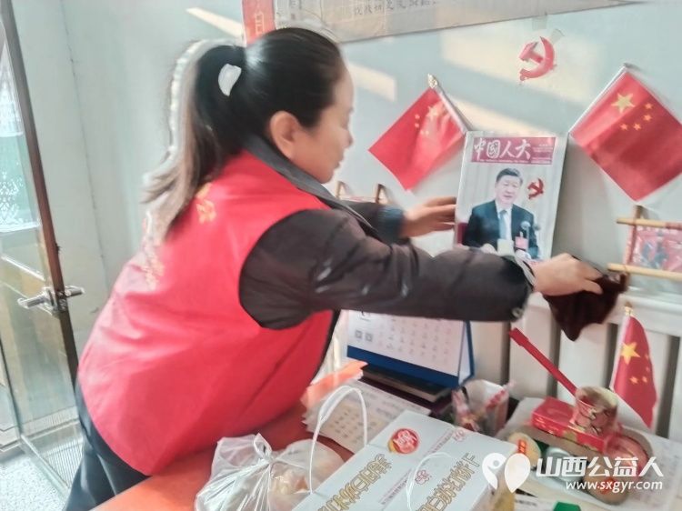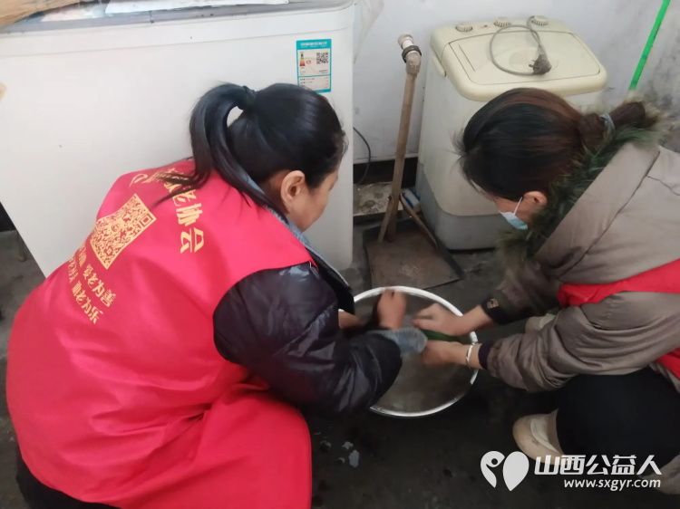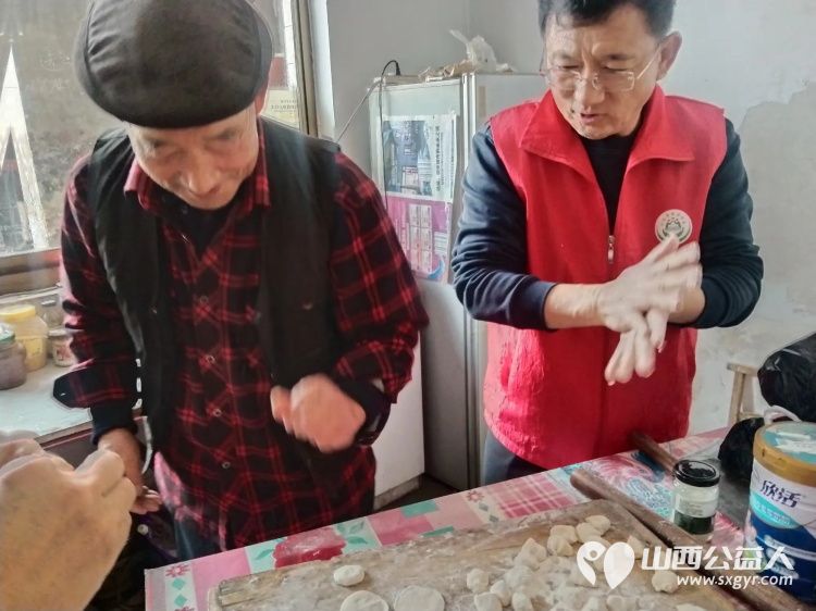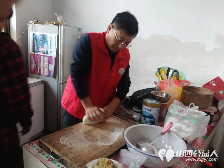 介休市敬老协会志愿者新年第一天走进连福镇义和堡村的84岁特困王士功老人家为老人打扫卫生做饭包饺子送去苏打饼干一盒苹果一袋