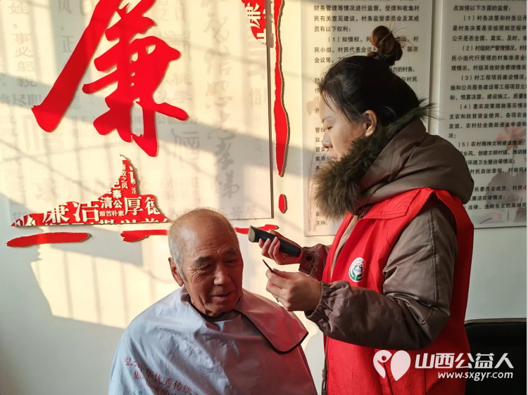 志愿者来到了连福镇新三屯村村委,在村委爱心理发师手法娴熟细心地为每一位老人修剪头发。