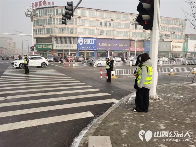 雪融守行途志愿护平安 文水县爱心帮扶志愿者协会的返乡学子赴文水街头守十字路口、传文明理念引导市民规范出行遵守交通秩序用点滴行动绘文明底色