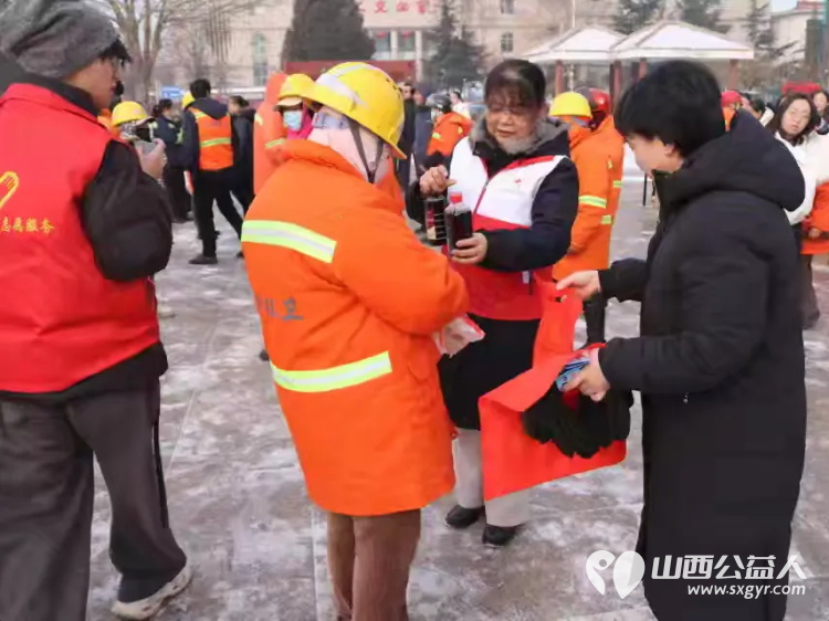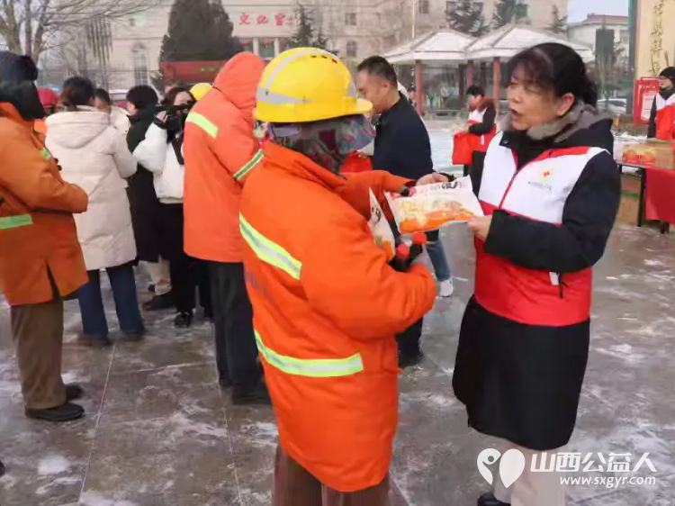 点滴关怀聚暖流寒冬帮扶暖人心----长治市屯留区红十字会腊八节活动传递温情志愿者们准备了食用醋面片对联保暖手套耳罩等物资送到环卫工人手中