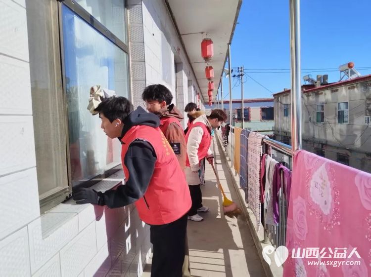 活动伊始,大学生志愿者们拿起扫帚、抹布,分工协作开展迎新大扫除。他们仔细擦拭门窗玻璃,认真整理公共活动区域,让养老院的每个角落都焕然一新。忙碌的身影穿梭在各个房间,不一会儿就营造出干净清爽的节日氛围。